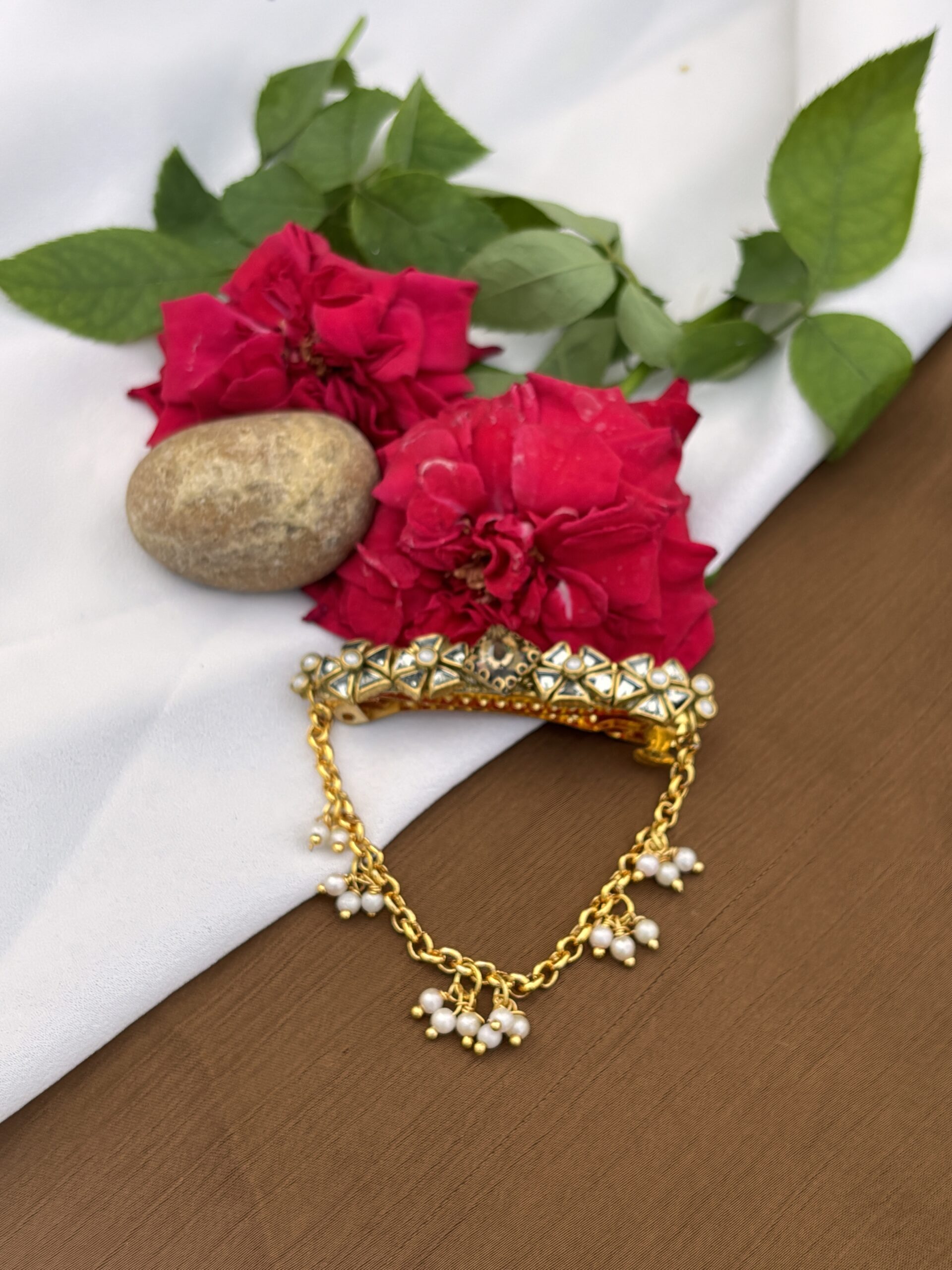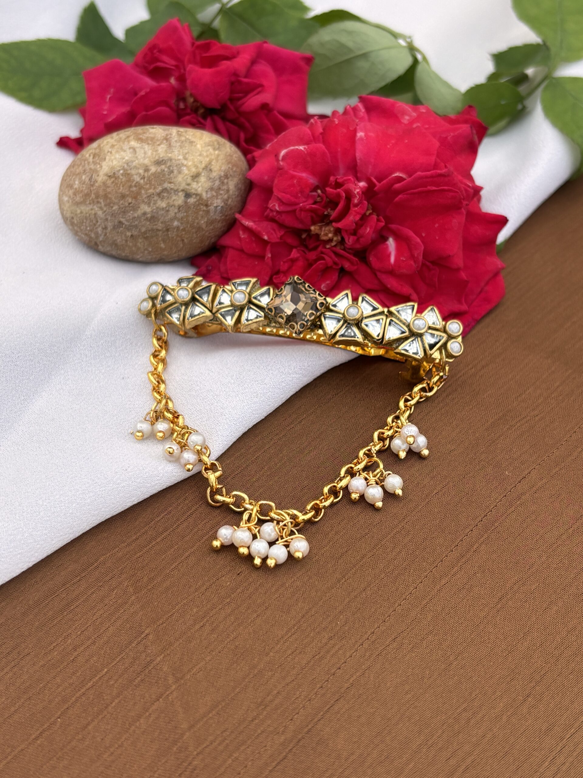 Exclusive white hexagon Devasenai Kundan clip that symbolizes grace and elegance.